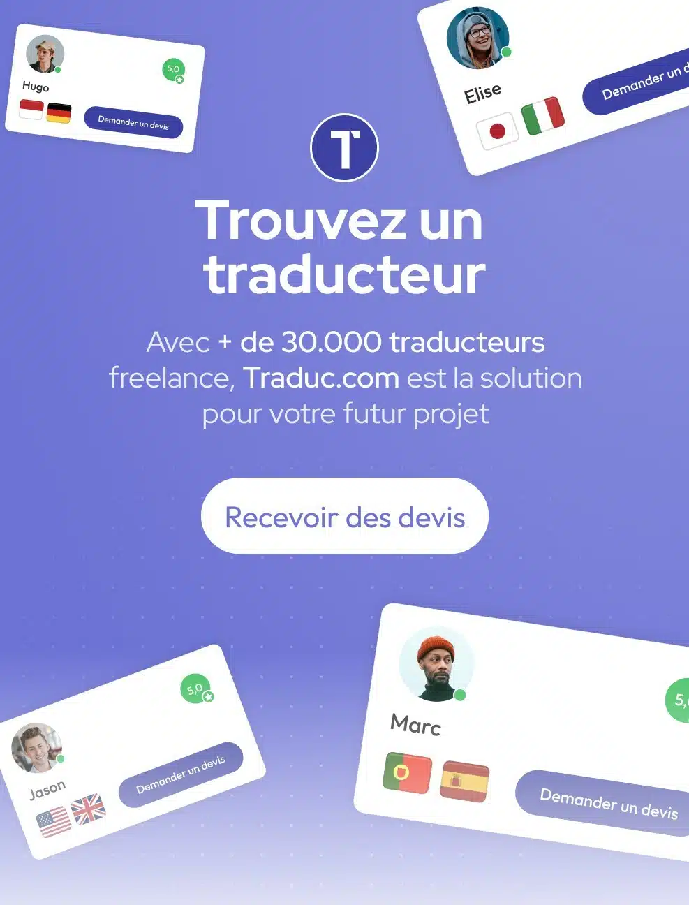 En sollicitant Traduc.com, des chefs de projet se chargeront de la traduction de votre site internet de A à Z. Alors n’attendez plus et envoyez-leurs votre cahier des charges ou demandez gratuitement votre devis.